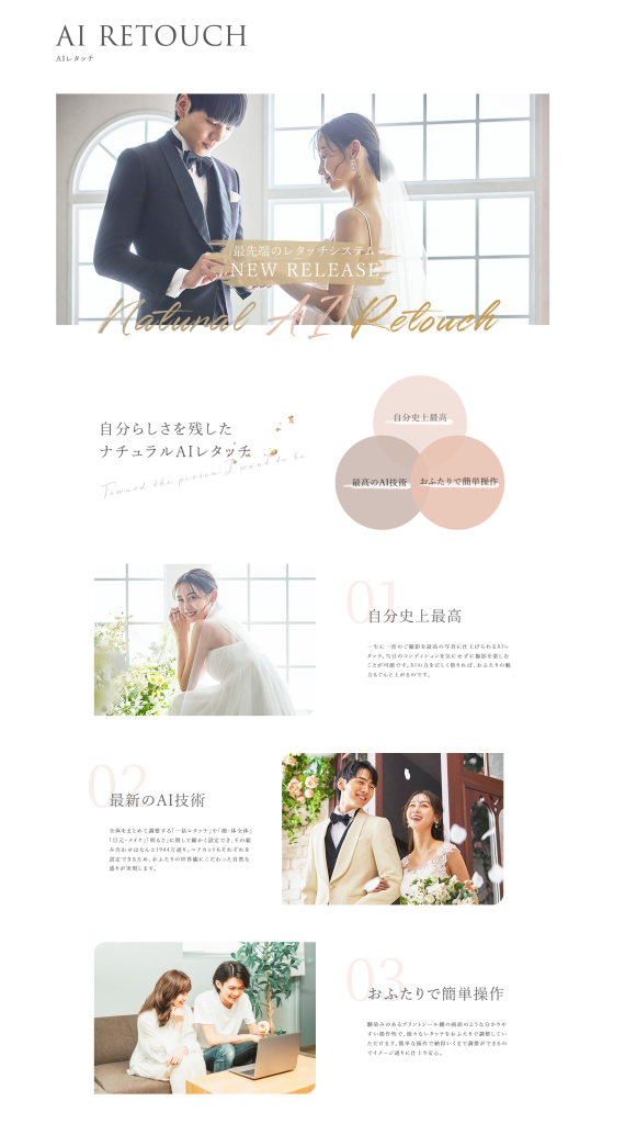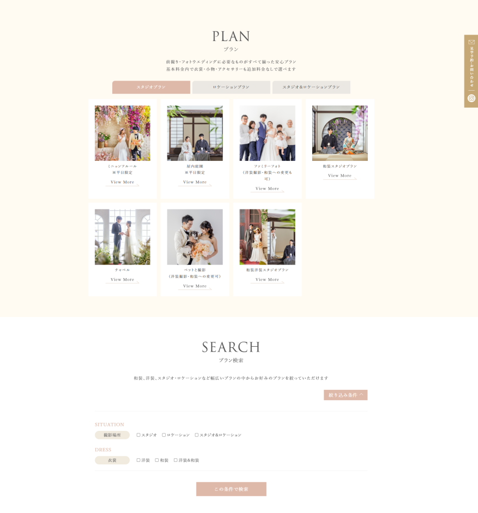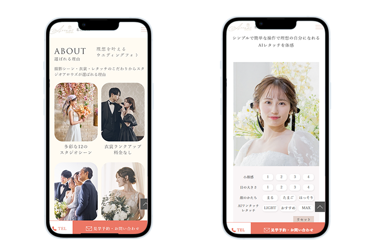 プラン検索機能をシンプル化・可視化し、お客様が直感的に「衣裳/撮影スタイル/料金」までたどり着ける導線設計を実現。また、現場担当者がリアルタイムに更新できる管理システムを導入し、鮮度の高い情報発信を可能にしています。さらに、最新のAIレタッチシステムをユーザーご自身がサイトで体験できるようにしました。