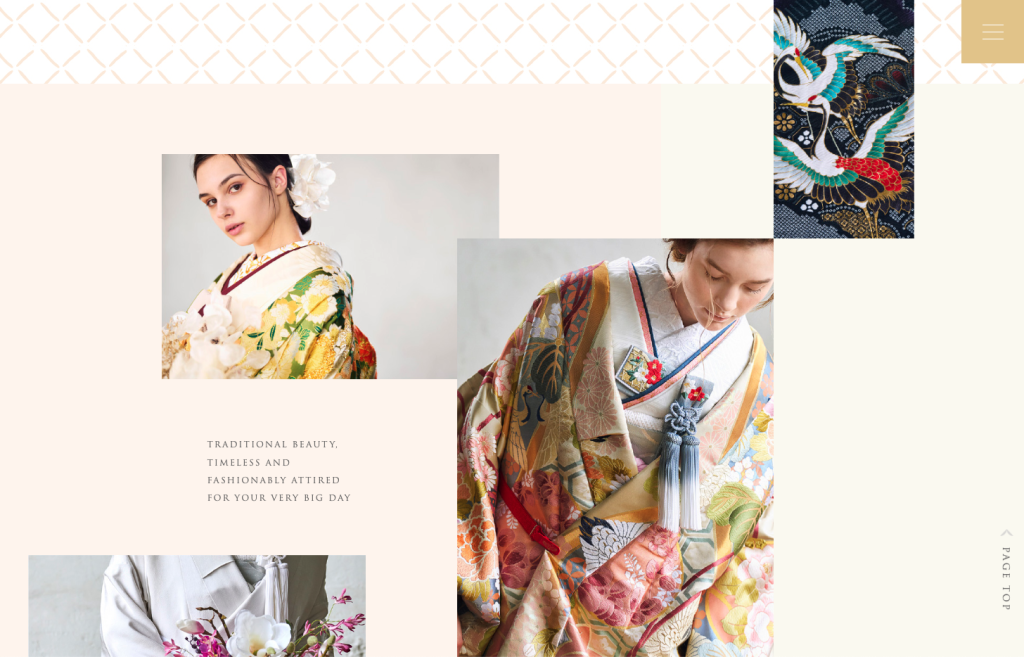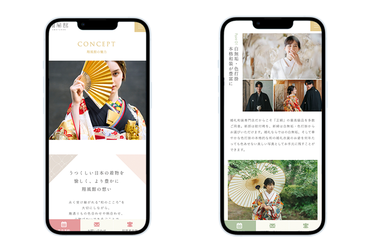 和装専門店ならではの伝統美と繊細なこだわりを大切に。和装レンタルとフォトスタジオをわかりやすく分け、ユーザーが迷わず快適に利用できる構成で、上質な和の世界観を表現しました。